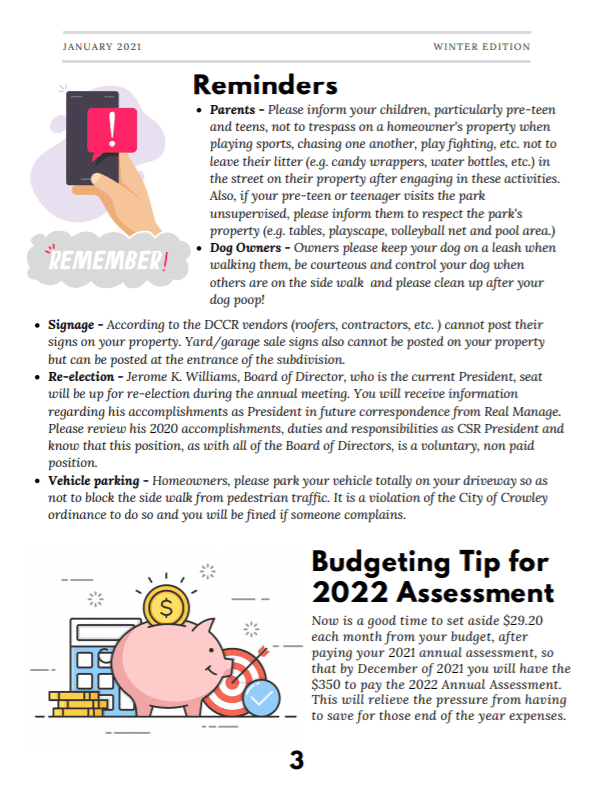 (B) annually sending a copy of the policy, separately or included in routine communication from the property owners’ association to property owners, by: